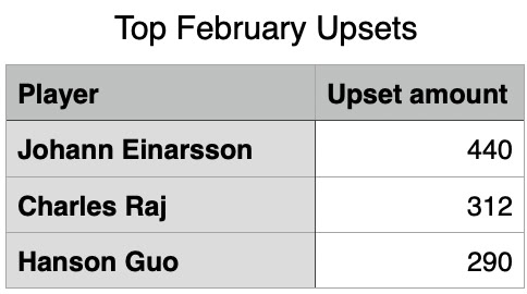 Last Friday was our Chuck Yeager’s Birthday Open. In the Bell X-1 section, Andrew Wu took first, and Lance Ngo and Carl Yu tied for second. In the Air Force section, Chris Pradeep won first place, and Aryah Shah and Soham Sethi tied for second. Finally in our Mach One section Reyansh Modi won first, and we had five way tie for second. We will have two concurrent tournaments on February 13 and 20. There will be two regular game 30 tournaments, as well as a slower game 45 tournament with 2 rounds on each day. If not enough players sign up for the slow tournament, then they’ll be transferred to the fast tournament.